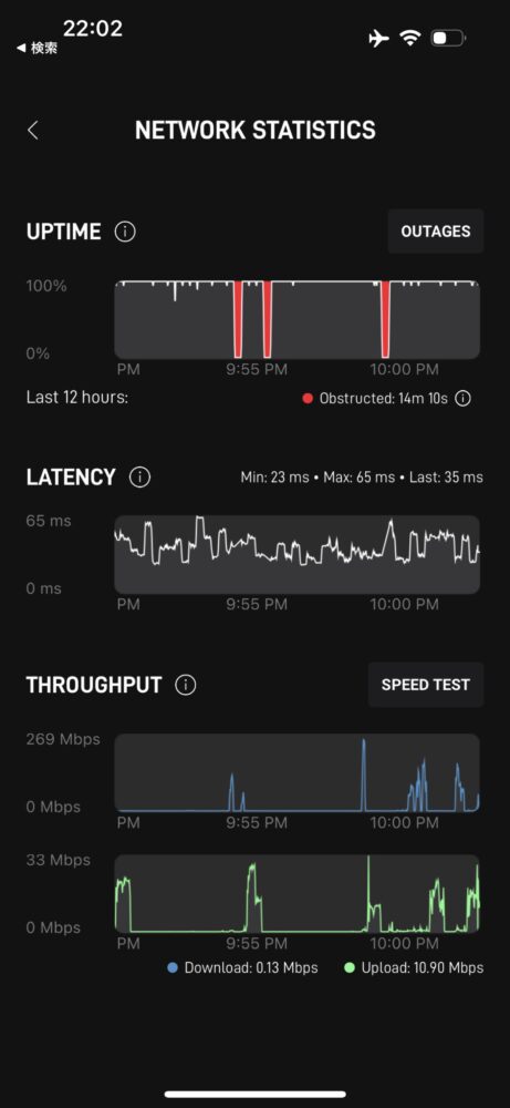 アプリを見てみると、時折通信ができないタイミングがあるようだ。衛星の位置の問題かもしれない。ライブ動画試聴や、ビデオ会議だと困るかもしれないが、上空が開けた場所に設置すれば、そういう問題もないのかもしれない。