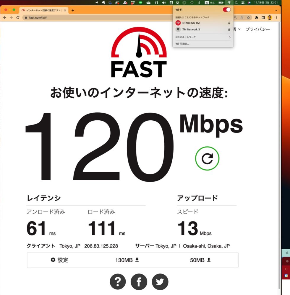 MacでStarlinkのWi-Fiに接続してみると120Mbpsの速度が出ていた。