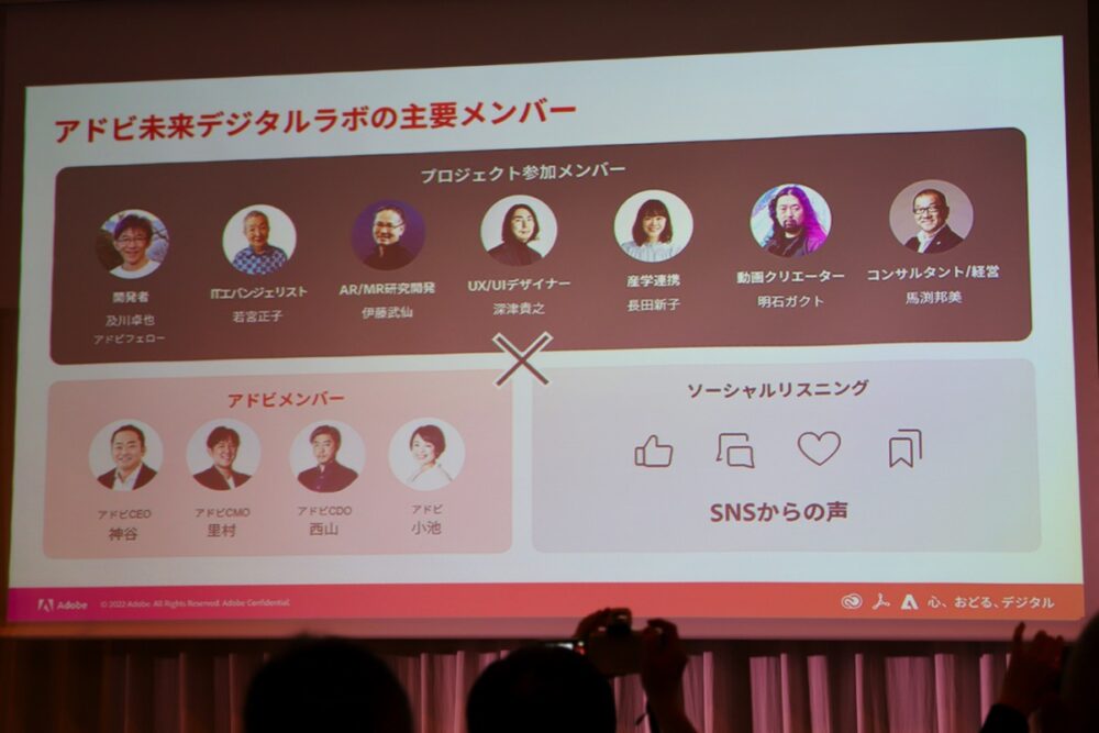 主要メンバーはアドビの役員に加えて、アドビフェローであり開発者の及川卓也さん、ITエバンジェリストの若宮正子さん、AR/MR開発者の伊藤武仙さん、UX/UIデザイナーの深津貴之さん、産学連携の長田新子さん、動画クリエイターの明石ガクトさん、コンサルタント/経営者の馬渕邦美さん。ソーシャルリスニングとしてSNSからの声も聞くという。