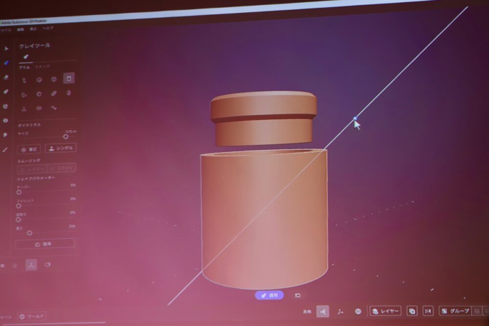 ステージでは、Substance 3D Modelerで、円筒形を重ねてモデルを作るところからデモを開始。