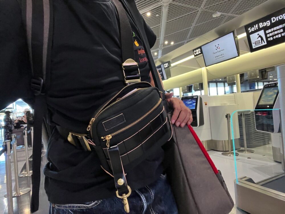 大きなバッグに入れると、身体から離してしまうことになるし、日本より治安のよくない国が多いことを考えると、デニムや上着のポケットというのもスリが心配だ。肩掛けバッグだと、他のリュックやショルダーバッグと絡んでしまって扱いづらい。