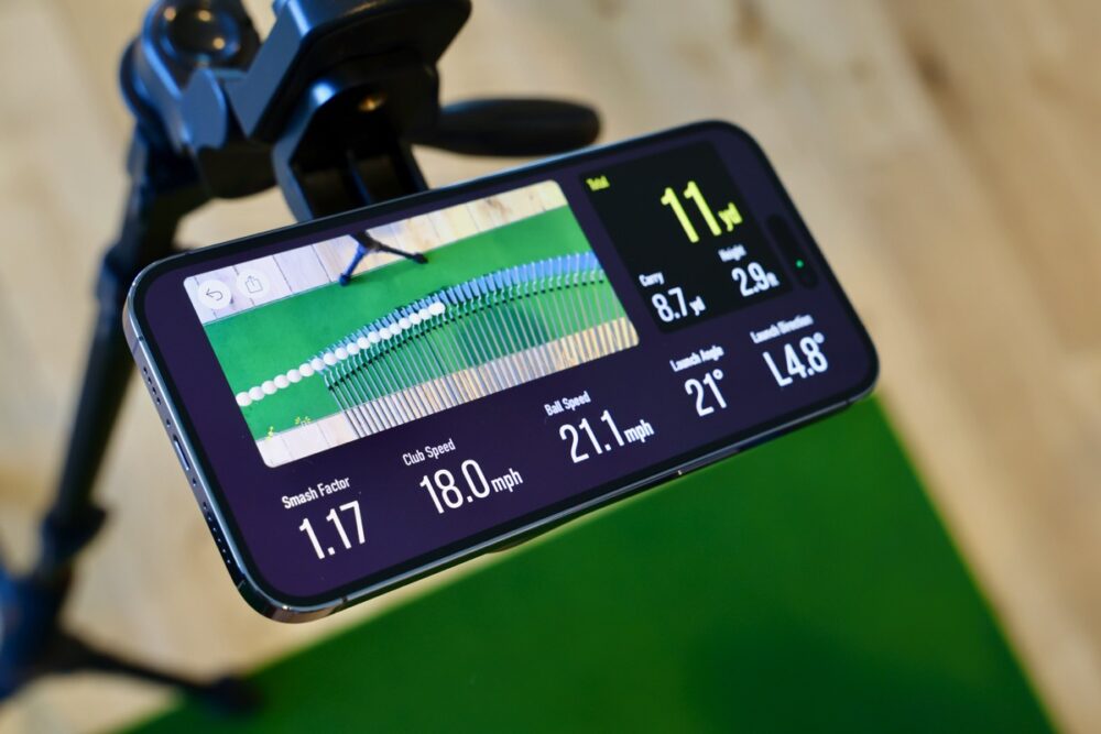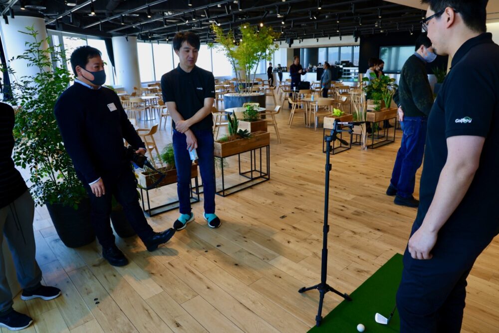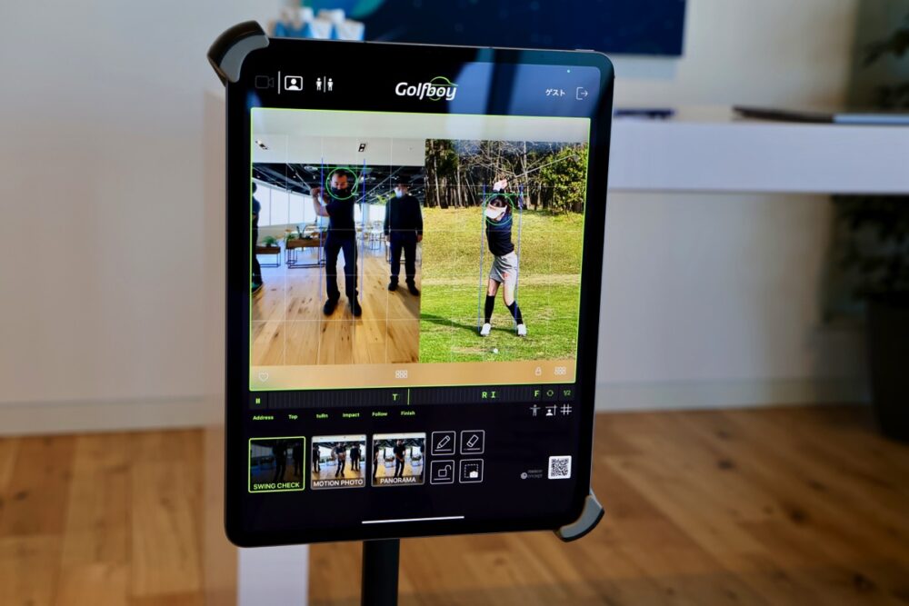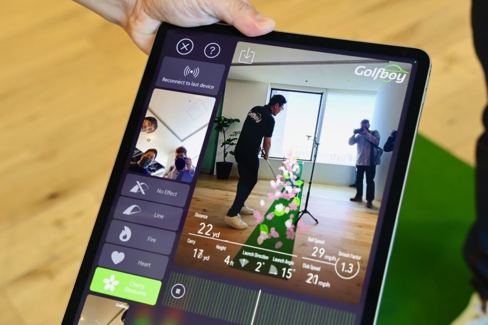 データを解析しているiPhoneと、別途iPadを連携させると、スイングのフォームを別の端末に表示することができる。これにより、広いスペースがなくても、自宅でもショットやパターの練習を行うことができる。