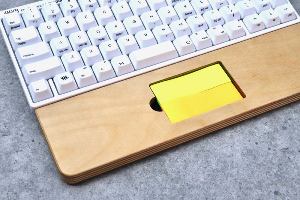 これは、75×50mmサイズの付箋を収納するポケットが付いたパームレスト。