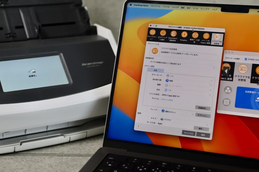 上記設定を保存すると、Mac側のアプリにも、ScanSnap iX1600のタッチパネルにも『クラウドで名刺管理』というボタン(プロファイルと呼ぶ)ができる。あとはこのプロファイルをタップするだけで、自動的に最初の設定でEightに送られる。