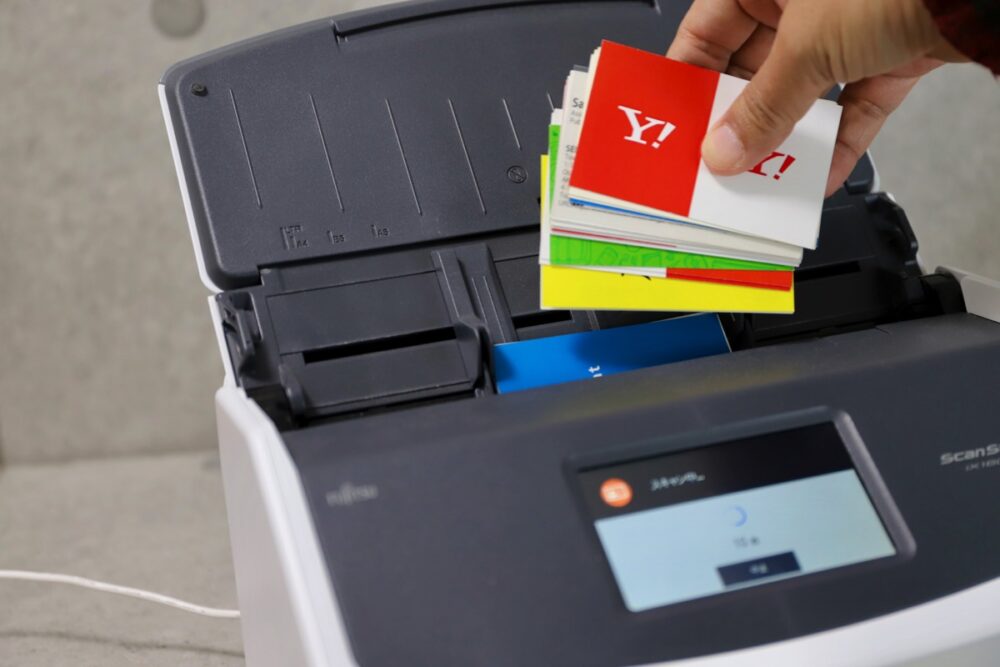 そして、奥側の名刺が下になるように、少しズラしながら追加していくと、続けて大量の名刺をスキャンしていくことができる。筆者は今回も大量に溜めてしまったため、1000枚ぐらいの名刺を読み込んだが、それでも準備などを含めても30分もかからなかった。スマホアプリで撮影してたら……と思うと気が遠くなる。
