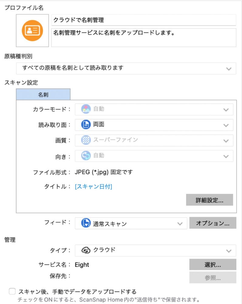 下が、筆者の名刺読み込みの設定。読み取り面を両面にして、クラウド経由でEightと連携している。