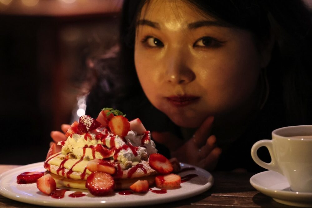 こちらはストロベリーパンケーキにピントを合わせているのだが、なんと感度2万5600で、F4.5、1/100。相当暗くても使える絵を撮ってくれる。もちろん手持ちだが、手ブレ補正のおかげでブレもない。