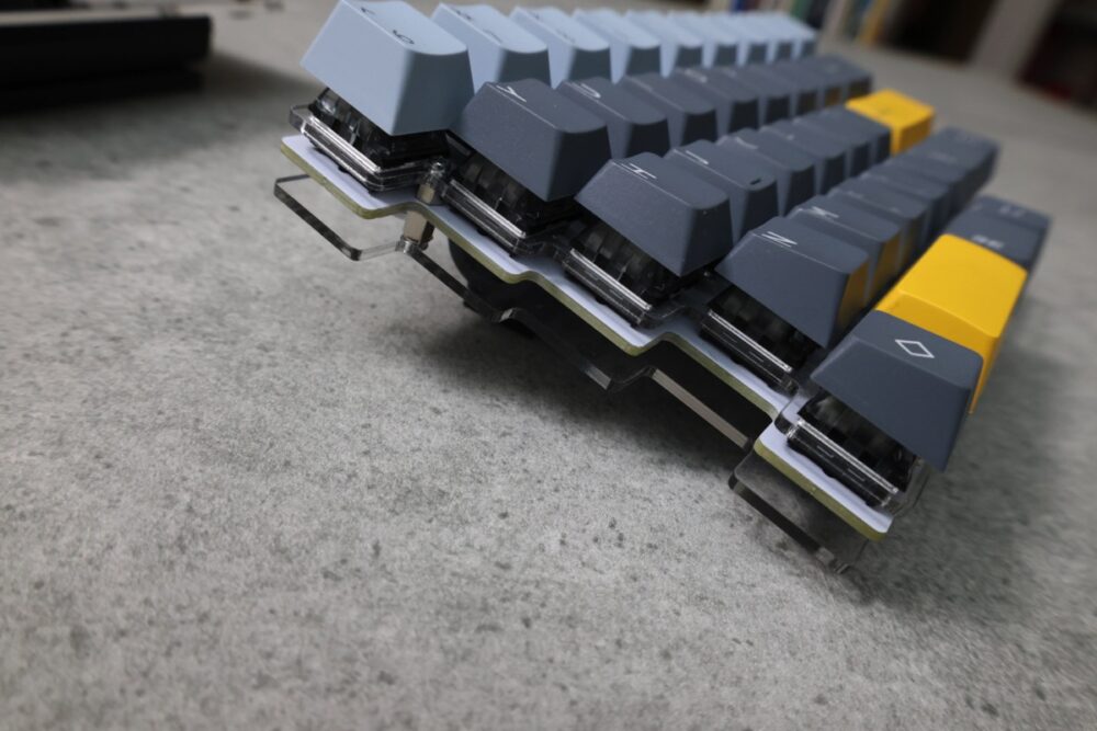 多くの場合、メインの基板と、回路が走る裏面をカバーするアクリル板と、キースイッチを保持するアクリル板の3枚組になっており、ネジでフローティングされる構造になっている。