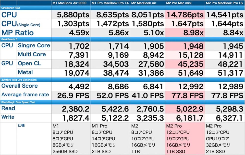 それぞれ、本機(M2 Pro Mac mini)の立ち位置を明確にするためにピックアップした。