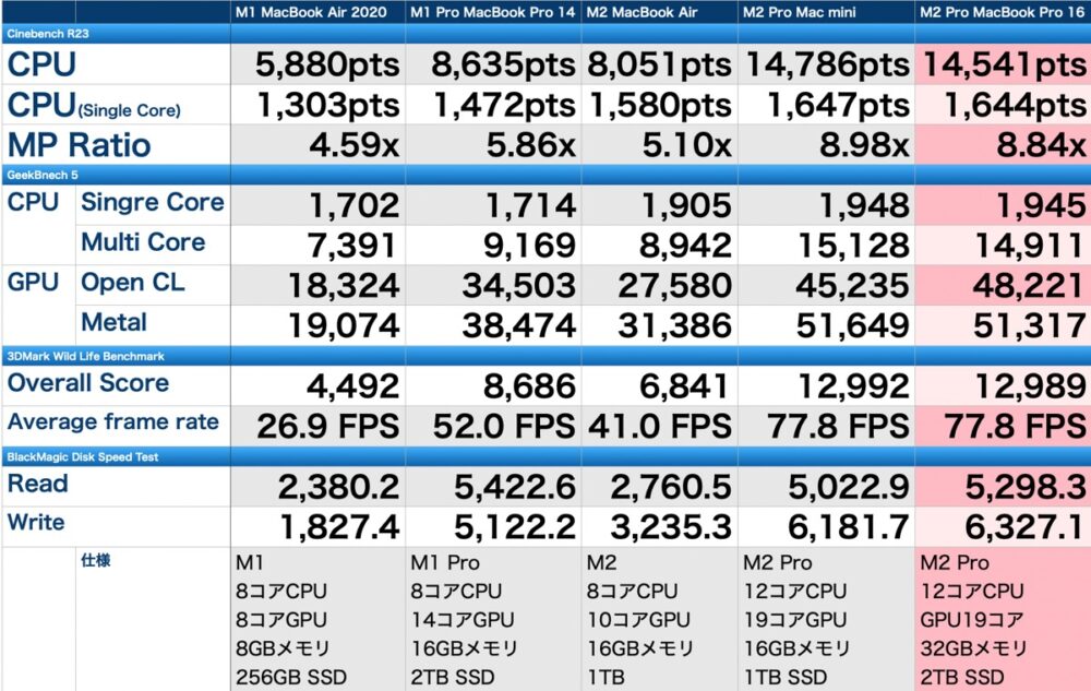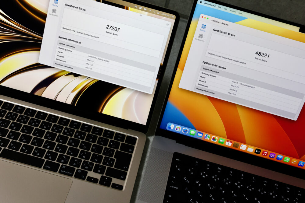 M2 のMacBook Airと比較すると、CPUにおいては高性能コアの数が4から8に倍加しており、大きな性能向上に繋がってることが分かる。GPUにおいても、M1からM2への性能向上だけでなく、14コアから19コアへのコア数の増加も性能を支えているといえるだろう。