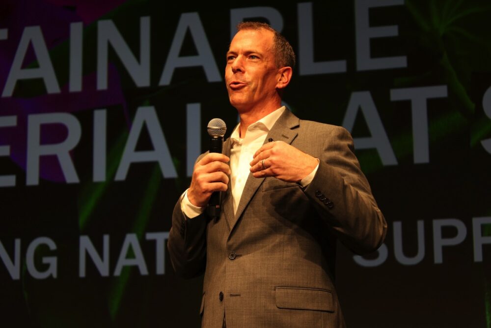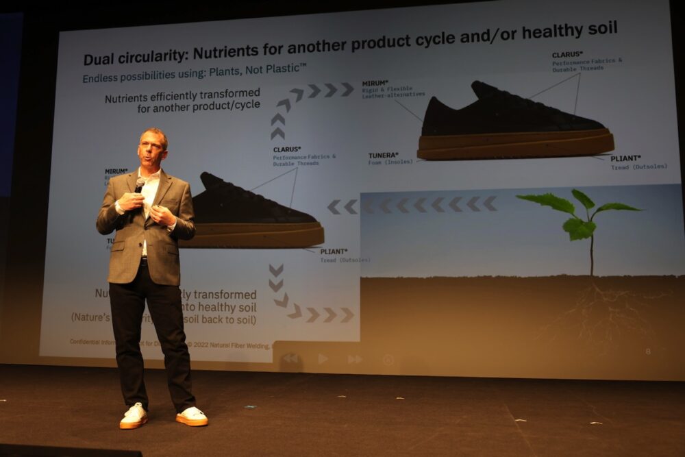 3つ目の[STARTUP PITCH]は、植物由来のレザー、ゴム、布的素材を作っている、Natural Fiber Weldingの代表、Steve Zikaさん。