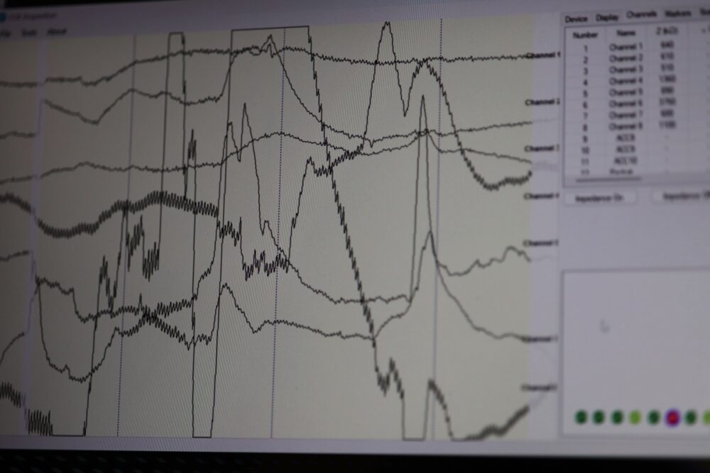 これが、私の脳波らしい。シロウト目には何がなんだかわからないが、首部分の左右にアースがあり、後頭部に8つの端子があったので8カ所の電位差が取得されているのだろう。