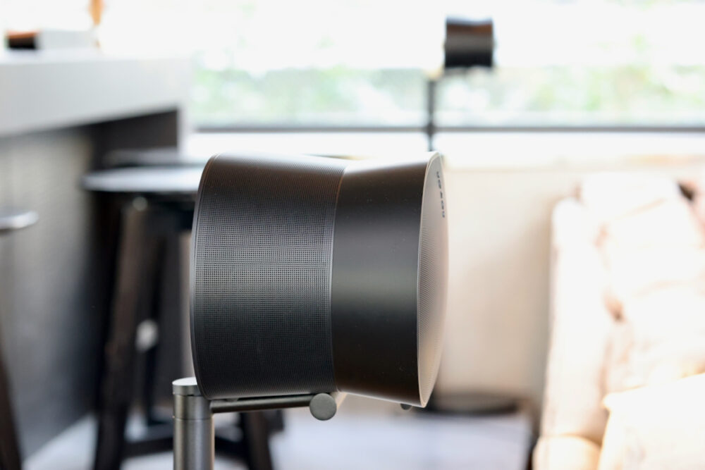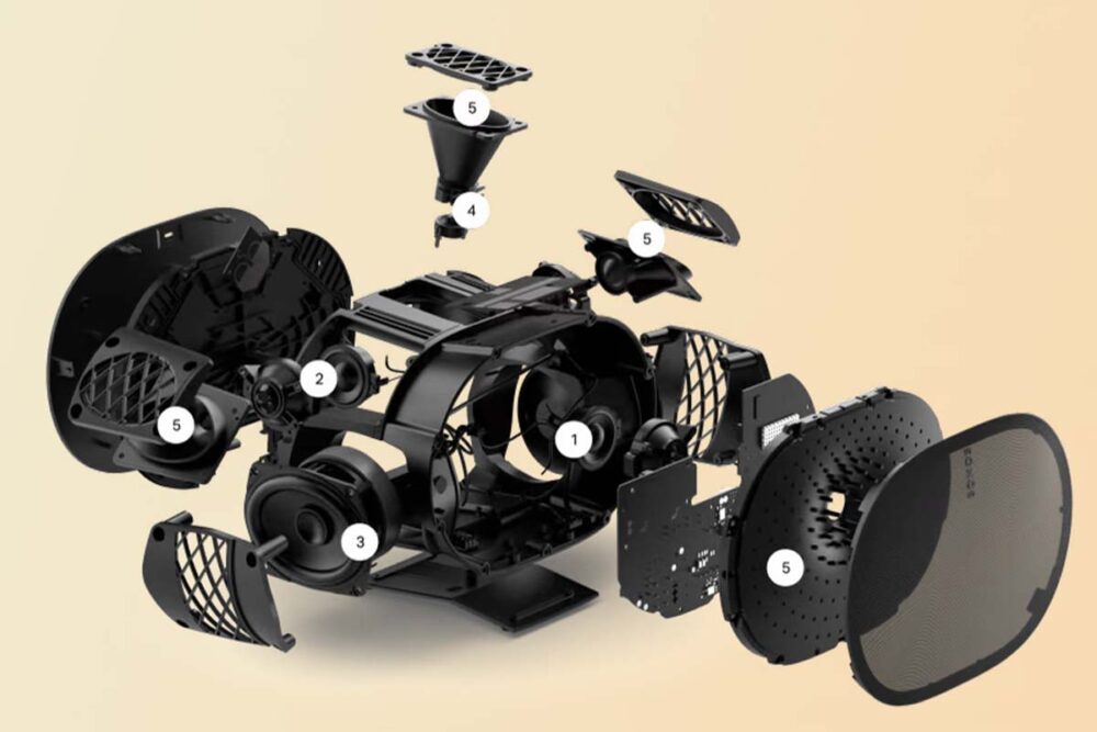 音響効果のために鼓状のくびれたボディには左右、中央、リア、そして上方に向けて4つのツイーターが内蔵されている。これにより、単体で豊かなステレオ感と、空間オーディオへの対応を実現している。