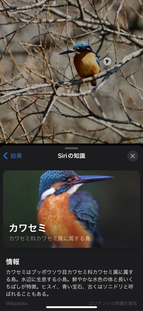 また、写真の下には、アイコンと『調べる—鳥』との表記が追加される。