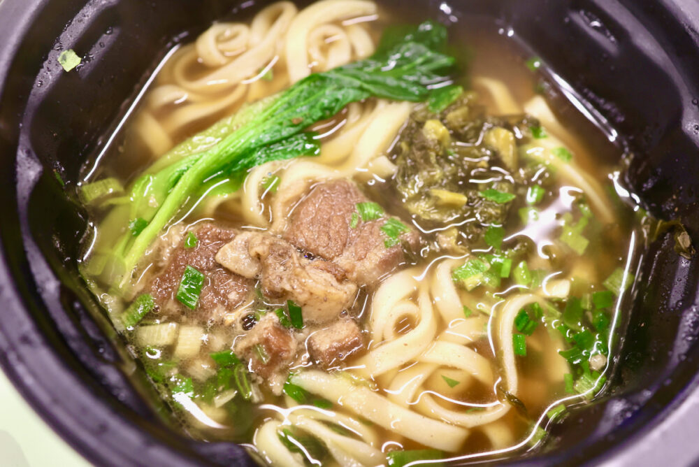 牛肉麺は台湾でもっともポピュラーな麺類のひとつだ。フタを開けた時に甘く広がる八角の香りは、台湾に来たかと錯覚を覚えるほど。トッピングされている牛肉は、厚く噛み応えもしっかりしており、噛むほどに肉の旨味が染み出してくる。麺ももちもちとしている。