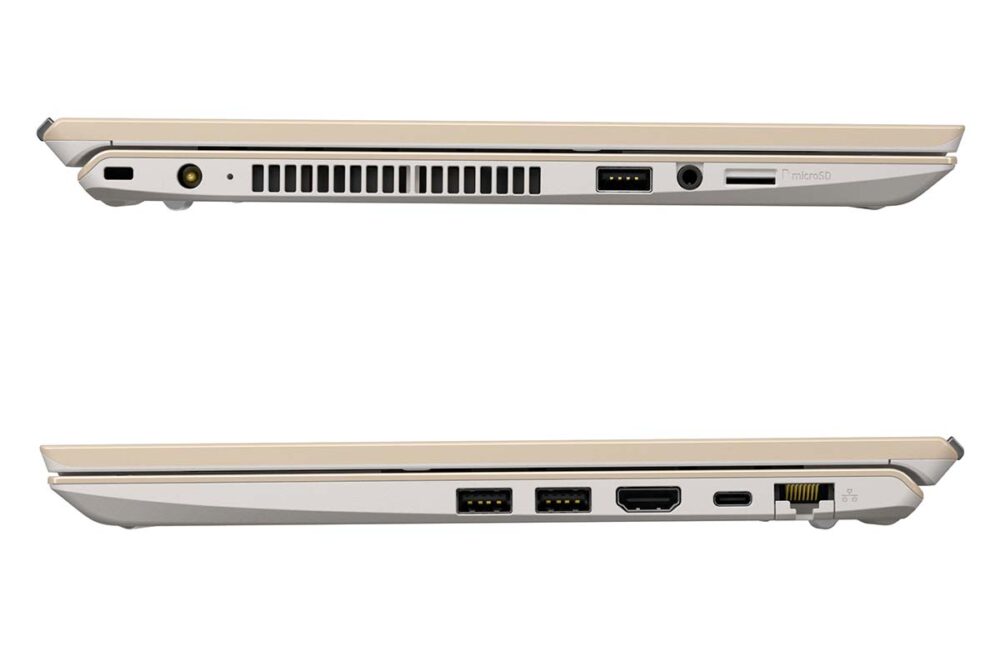 USB- Aポートが右に2つ、左に1つ設けられているのも一般ユーザーの使い勝手を考えてのこと。 フタで広がる方式のEthernetポートも、 HDMIポートもmicro SDポートも、ヘッドフォン/マイクコンボジャック、セキュリティロックスロットも設けられている。
