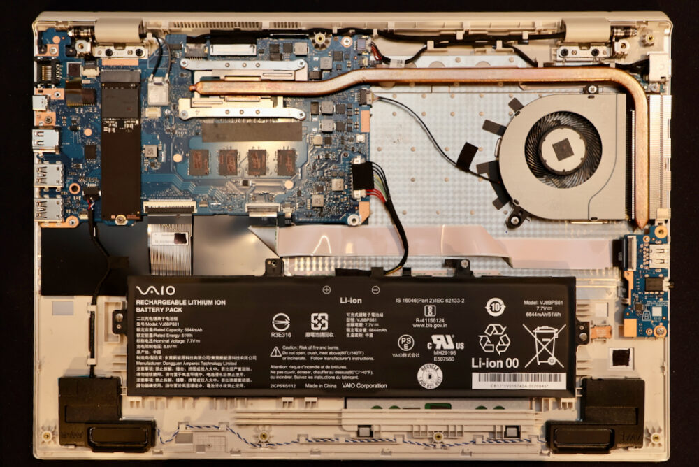 こちら F14の内部構造。ファンは1基でヒートパイプで チップセットと接続されている。ファンは Nidec製、バッテリーはTDK製と、日本メーカーの製品を使うことで高い品質を担保している。ご覧になってわかるように、それほど内部的な集積度合は高くなさそうに見える。