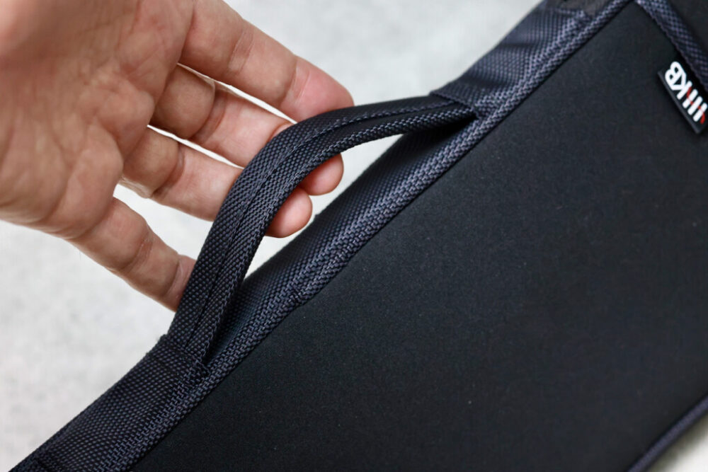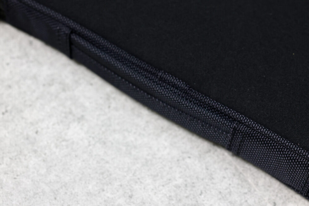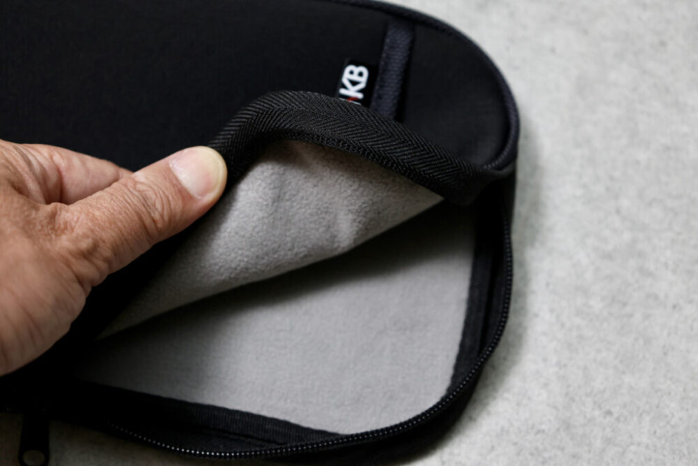 表面はクッション性に優れるネオプレーン素材。内側は起毛素材となっている。さらにエッジ部分にはパイピングが施されており、HHKBを衝撃から守ってくれる。ポケットの中には薄い素材が使われており、全体に厚くなり過ぎないように工夫されているなど、実に至れり尽くせり。