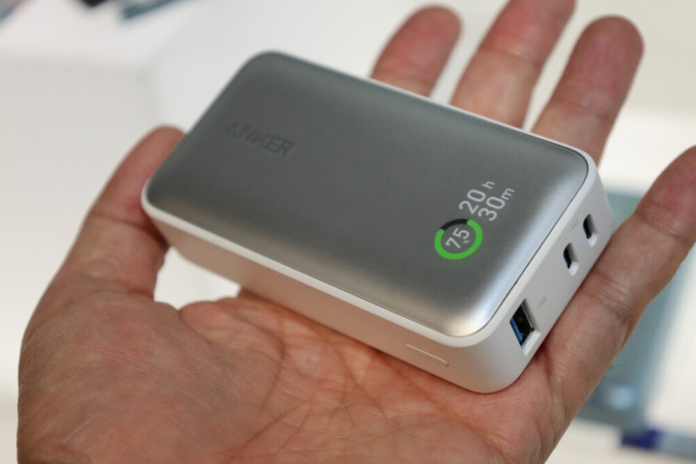 Anker 533 Power Bankは、USB-Cを2ポート、USB-Aを1ポート搭載しており、最大30W出力が可能。MacBook Airにも充電できるパワーを誇る。カラーバリエーションは5色。小型ディスプレイを搭載しており、現在の残量や、その時点での流量で、あと何時間使えるかが表示される。