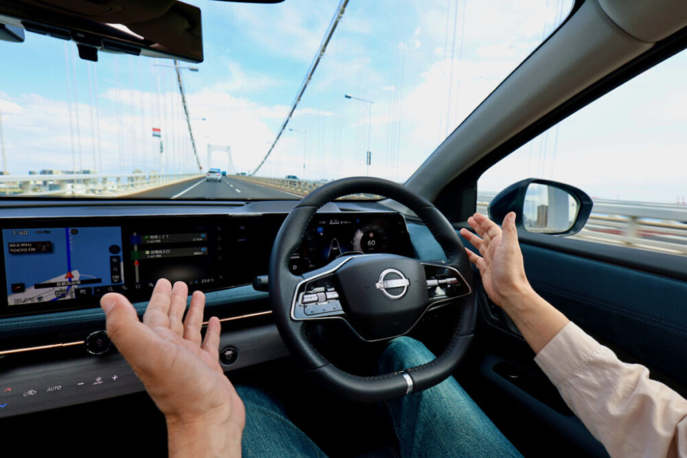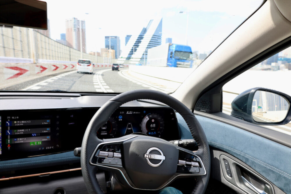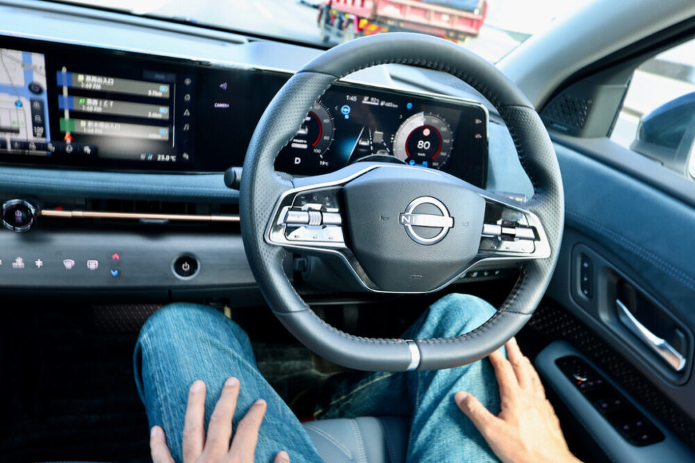ハンドルから手を離してもちゃんと車線を走り続けてくれるし、前のクルマに合わせて加減速もしてくれる。つまり、事実上、この状態で私は何もしていないのに、アリアは走り続けてくれているのだ。カーブがあっても、ちゃんとステアリングを切って曲がっていってくれる。これは驚きだ!