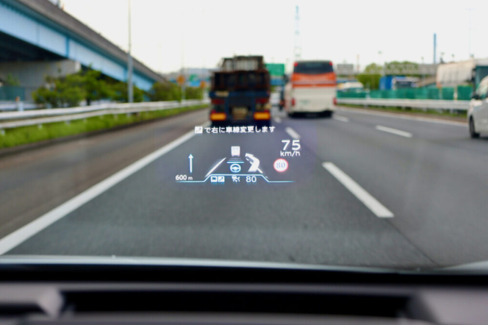 HUDを装備しており、ドライバー目線(助手席の人に、運転者の胸元から撮ってもらっています)で見ると、ご覧のように路面に速度や、プロパイロット2.0の設定が表示される。ブルーのハンドルアイコンが、運転制御が可能になったことを示している。