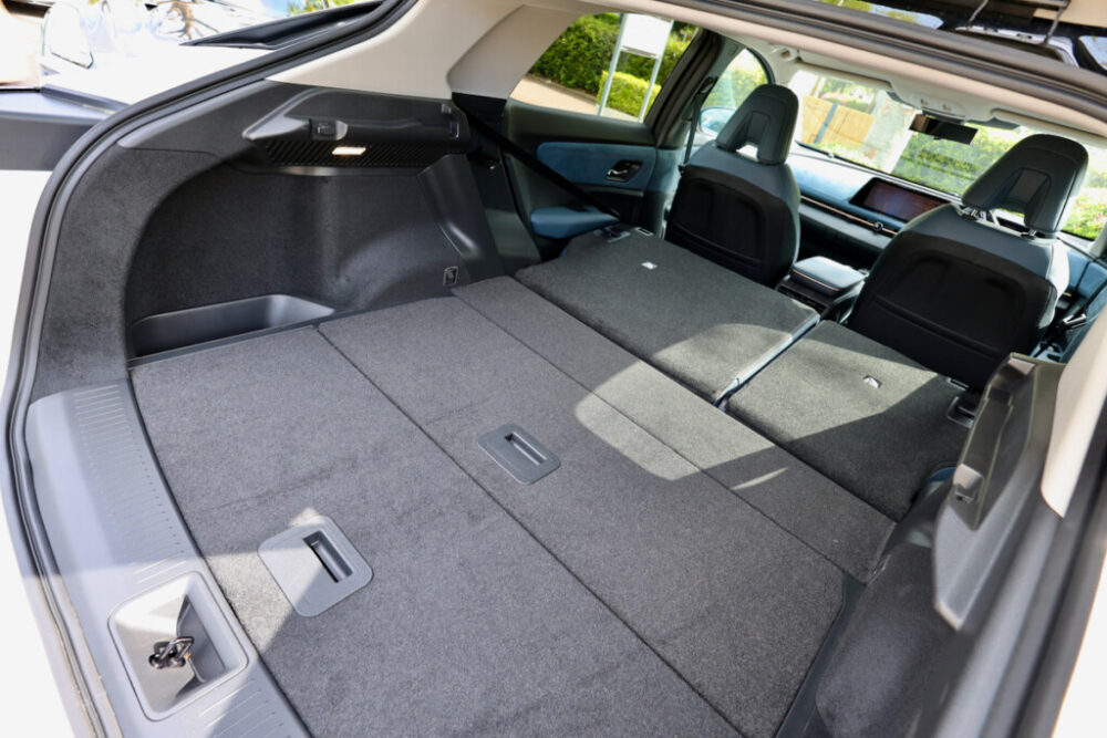 後部座席を倒すと広大なスペースが出現するが、それでも床は少々高い。
