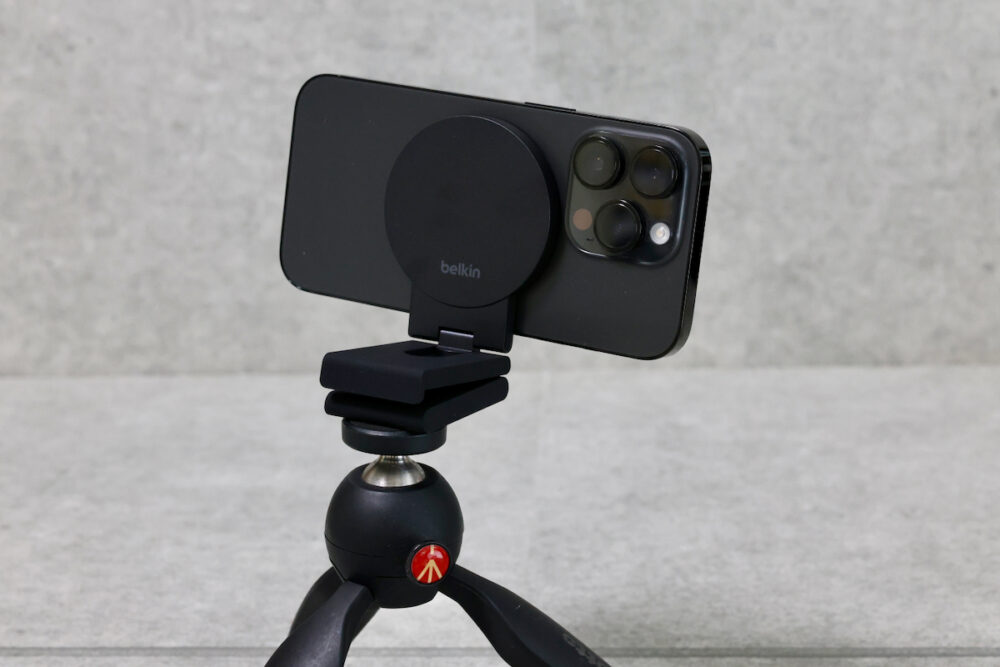 このおかげで、iPhoneを三脚にマウントするのにも使える。写真ではミニ三脚に載せたが、もちろんフルサイズの三脚にも使用可能だ。