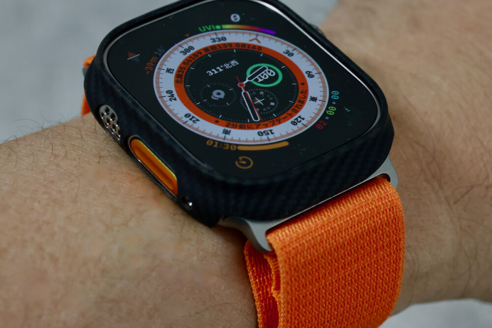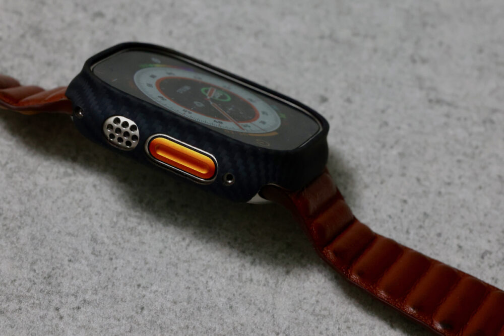 ケースというと、大柄なApple Watch Ultraがより大きくなるのではないかと心配されるかもしれないが、極薄なので使用感はほぼ変わらない。また重量も0.9gとほぼ変わらない。