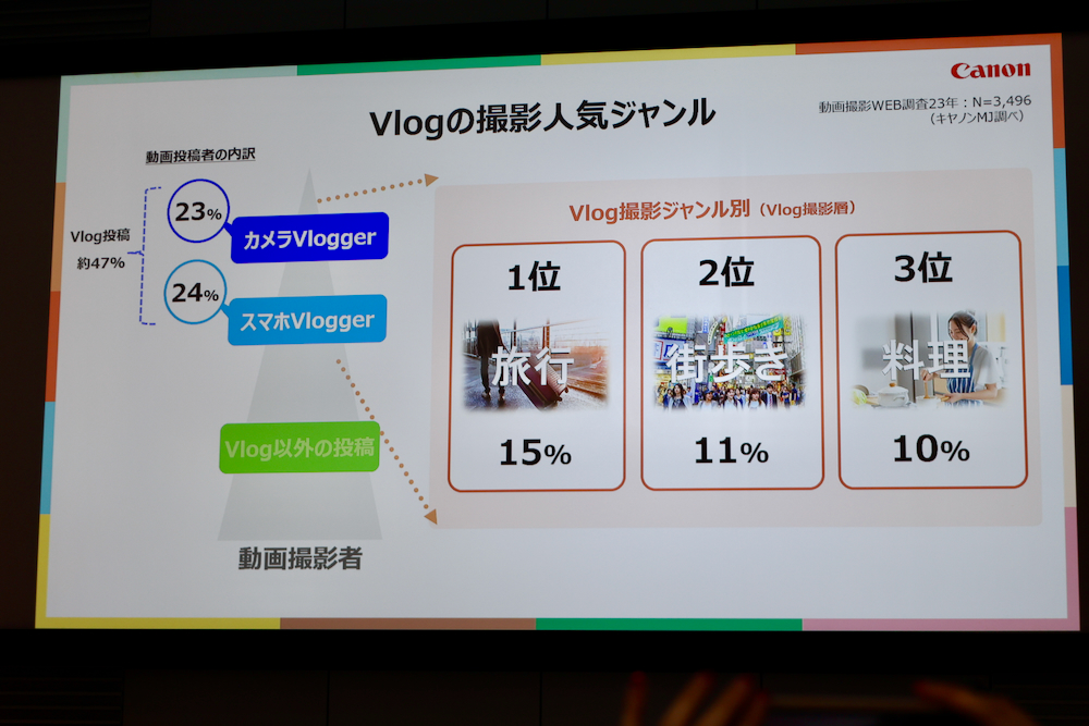 キヤノンの分析によると、Vlogをしているユーザーは『カメラVlogger』と『スマホVlogger』に分かれており、スマホVloggerは『もっと高画質で撮りたい』『スマホのバッテリーや容量を消費したくない』というニーズがあり、カメラVloggerには、『機材が多い・重い』という悩みがあるらしい。