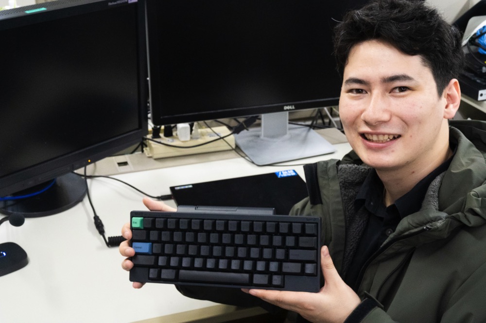大釜リアムさんは入社5年目。イギリスとアイルランドと日本の血を引く大釜さんは、企画開発部に所属。HHKBを使い始めて約2年。最新の、Professional HYBRID Type-SのUS配列、色は墨を使用。純正のカスタムキートップで、ESCキーグリーン、Controlキーをブルーグレーに変更している。