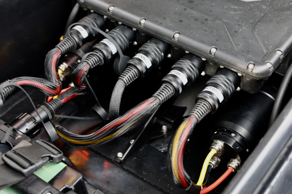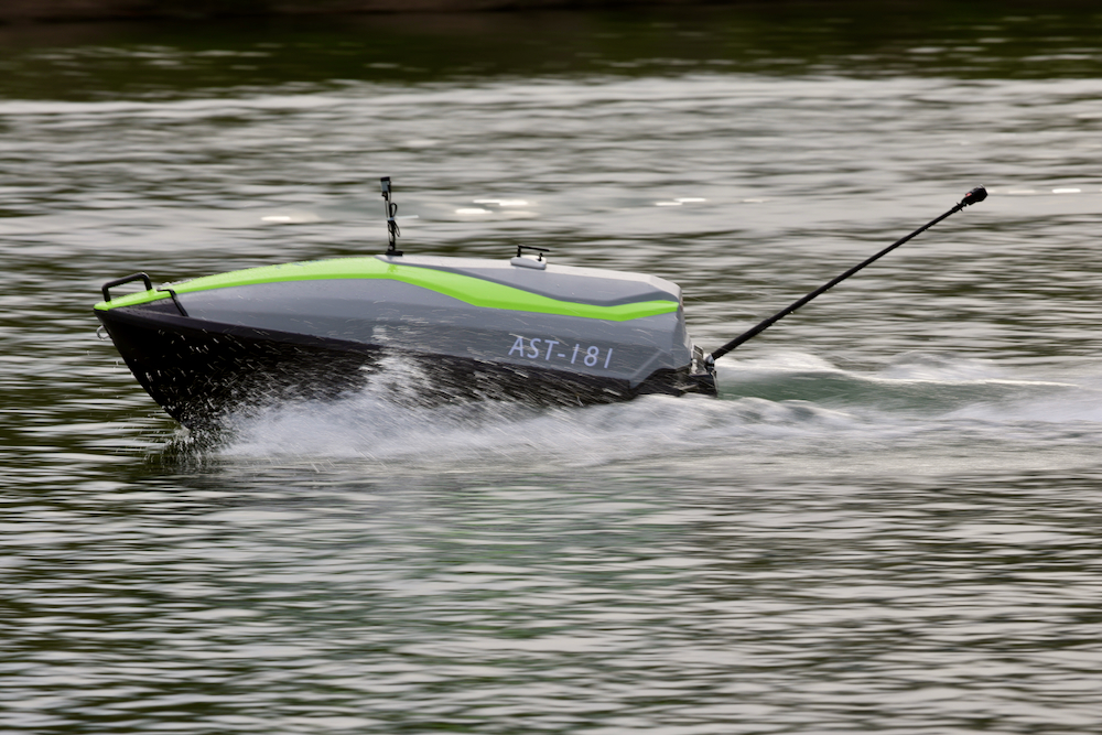 これは、トーイング用大型ラジコンボートをドローン化したもの。ジェットスキーのような水流ジェットを2機搭載した水上バイク。最高速度35km/hで、12kmの航続距離を持つ。