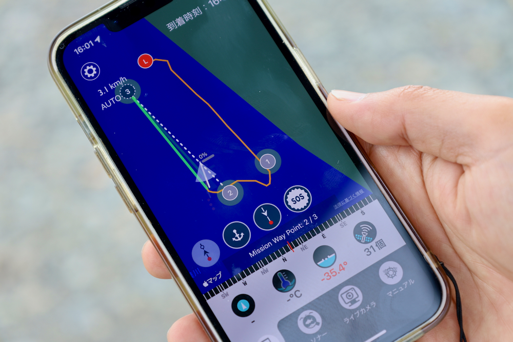 エバーブルーテクノロジーが開発した『eb-CONNECT』の画面上で、目的地をタップすれば、『AST-181』は自動的にターンして、目的地を目指す。