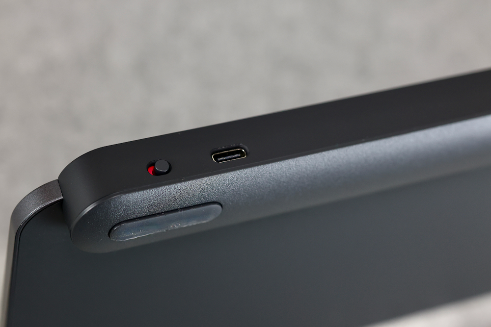 本体はアルミでできた板状だが、背面側はご覧のような形状になっている。この部分はプラスチックでできており、BluetoothやLogi Boltなどの電波を通す構造となっている。スイッチと充電用のUSB-Cポートもここにある。
