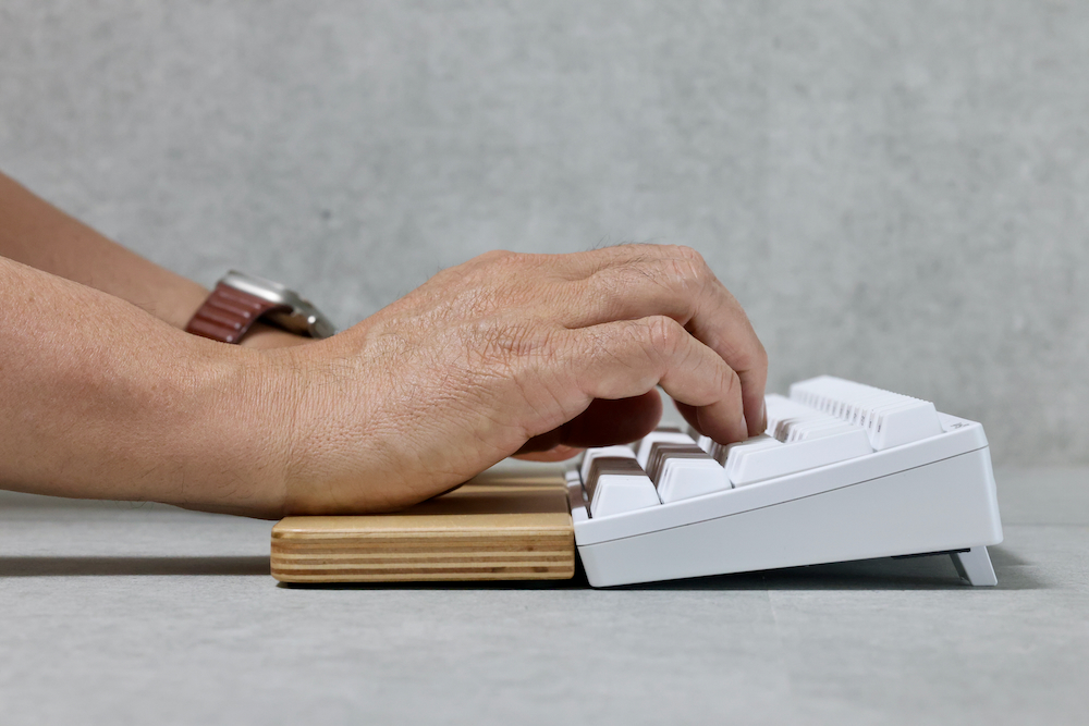 ユーザー側の姿勢にもよりますが、多くの場合、若干手のひらを浮かせて打鍵することになります。これが長時間続くとしんどいのです。そこで、タイピングベッドを置くと、これがピタリと収まって、楽になるというワケです。
