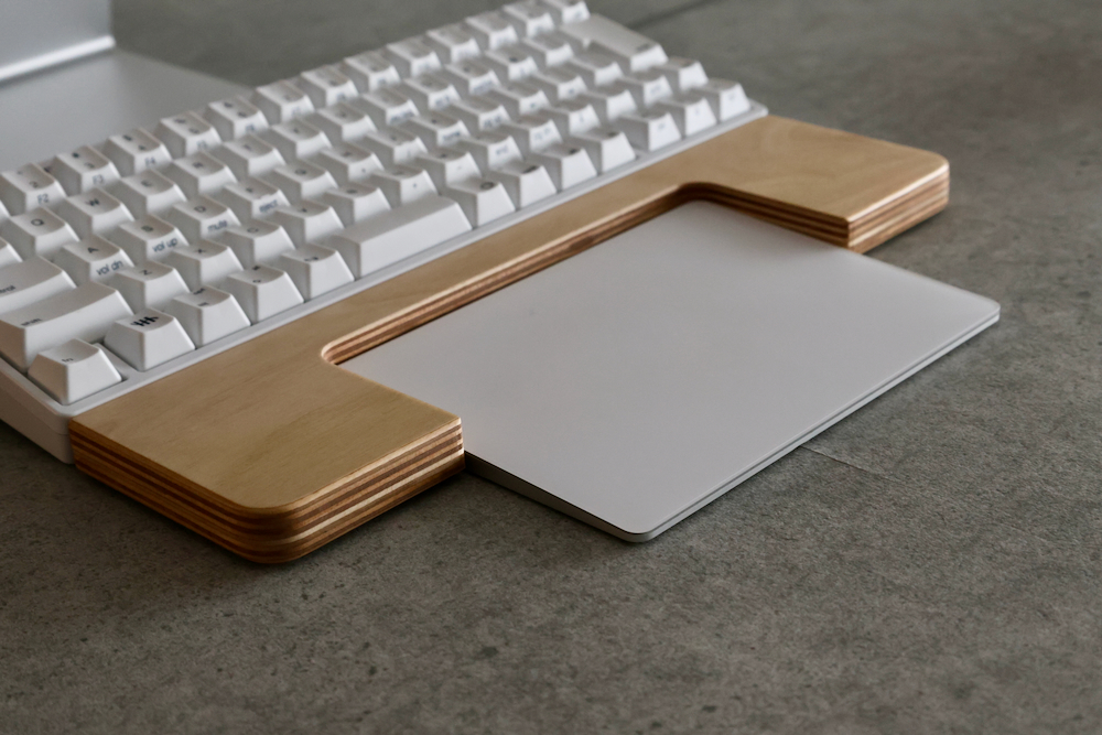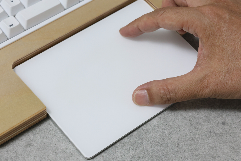 HHKBの手前に置けるパームレストとしてのバード電子製のトラックパッドですが、手前の中央部手前のスペースは特に使われておりません。そこに、Magic TrackPadを置けるように切り欠きを入れてもらった特注モデルです。