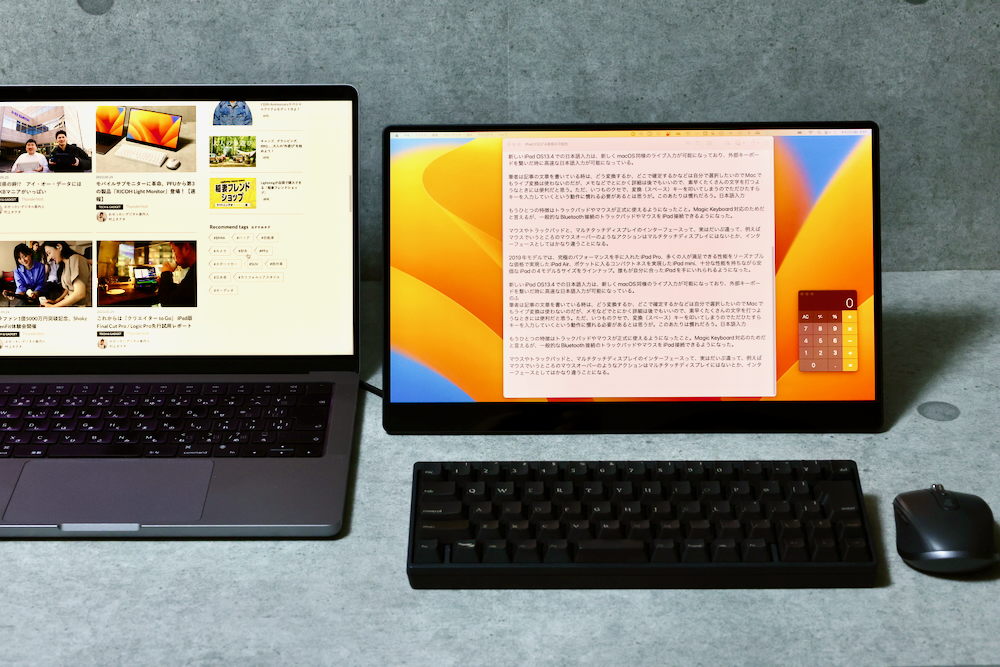 筆者の場合、MacBook Pro本体に資料を表示し、RICOH Light Monitorの方で原稿を書く。快適。