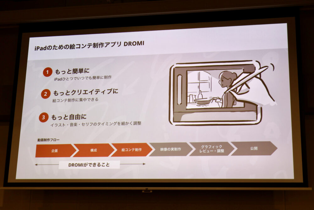 ラフを書いてその時間を割り当てていくことができるという絵コンテアプリで、ちょっと触らせてもらったが、これまでにない操作感で、これは動画作成に便利かも……と思った。