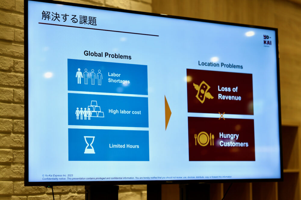 世界的な課題として、労働者不足、人件費の高騰、提供時間の不足が挙げられており、温かい食事を自動で提供できれば、助かる人が数多くいる。美味しい食事を自動調理ロボットで提供できるYo-Kai Expressがあれば、夜の高速道路のパーキング、時間外の駅、レストランが営業していない時間の空港など、温かいモノが食べられない場所で、たいへん喜ばれることになる。