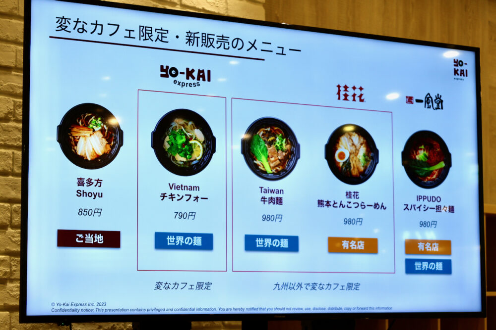 Yo-Kai Expressは、現在アメリカで100カ所以上、日本でも20カ所以上に展開しているが、日本ではすでにラーメン、うどん、そばなど、17種類のメニューが開発されており、それぞれの設置場所で食べられる麺が違うというのもユニークなところ。