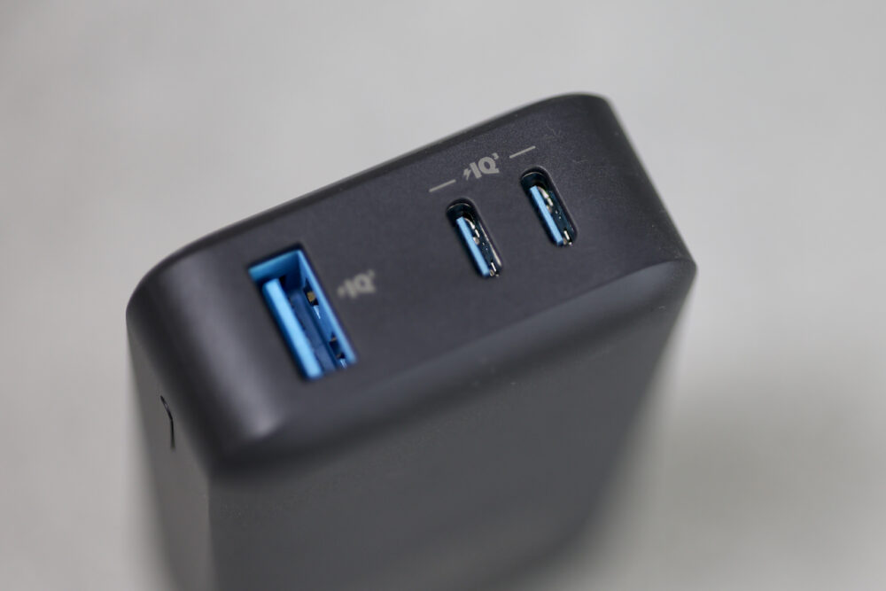 充電はUSB-Cポートから。出力はUSB-Cポート×2と、USB-Aポート×1。USB-Cポートからは、30W出力が可能なので、iPad、iPad Proはもちろん、MacBook Airクラスでも十分給電が可能。USB-Aポートからは最大22.5Wで出力することができる。iPhoneなどを急速充電することが可能。