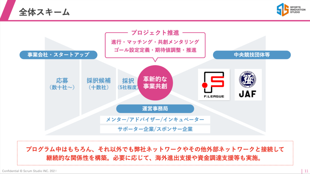 初年度は、日本フットサルリーグ(Fリーグ)、日本自動車連盟(JAF)が参加し、それらの持つ課題に、世界中のスタートアップのアイデアを組み合わせ革新的な事業共創を行い、そこにScrum Studioならではの、メンタリングや育成を行っていくとのこと。