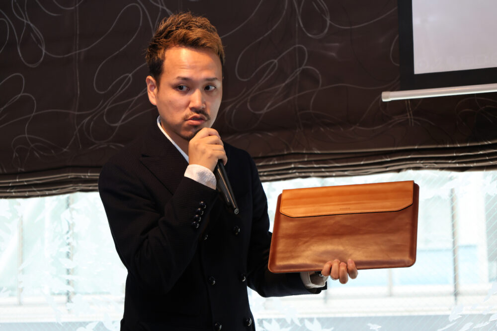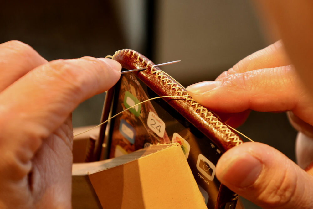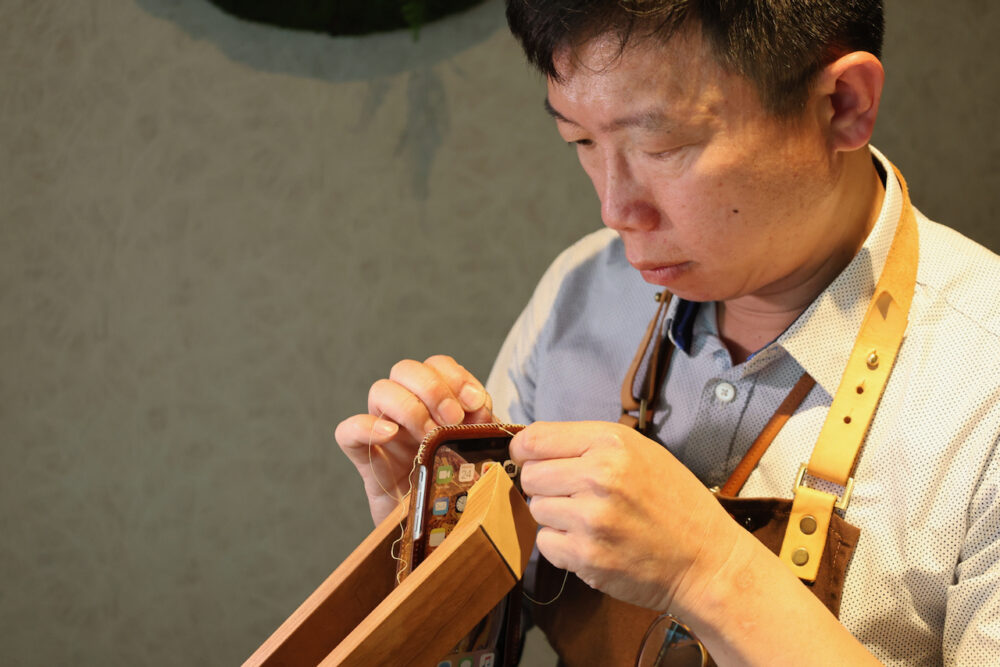 一般的なスタッフの方で、iPhoneケースひとつを縫い上げるのに、なんと1時間半も掛かるという。そして、それを我々の前で実演して下さったのはCEOのNeoさん。
