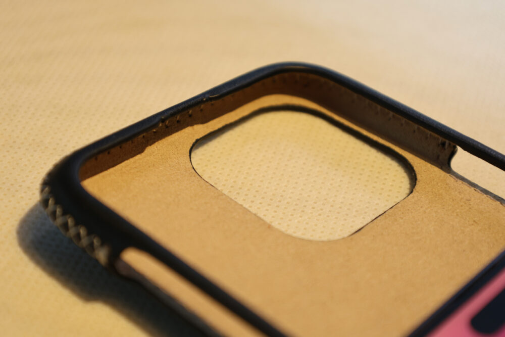 日本ではまだ未発売のこのiPhoneケースだが、革は細かく内側に折り込まれ、非常に精密な作りであることがお分かりいただけるだろうか?