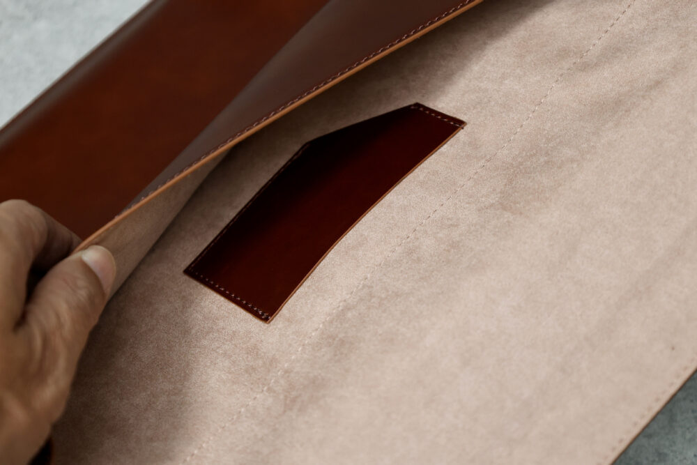 従来、本革製品にこだわってきたn max nだが、長く使い込むことのできる革製品は、1〜2年で更新されてしまうことの多いiPhoneには少々もったない側面があるという。ヴィーガンレザーは、まだiPhoneケースに使えるほどの強度はない(現在のn max nのデザインだと、縫い目の部分の強度が足りないという)が、それほど強度が必要なく、逆に軽さが必要とされるMacBookケースには向いていたという。