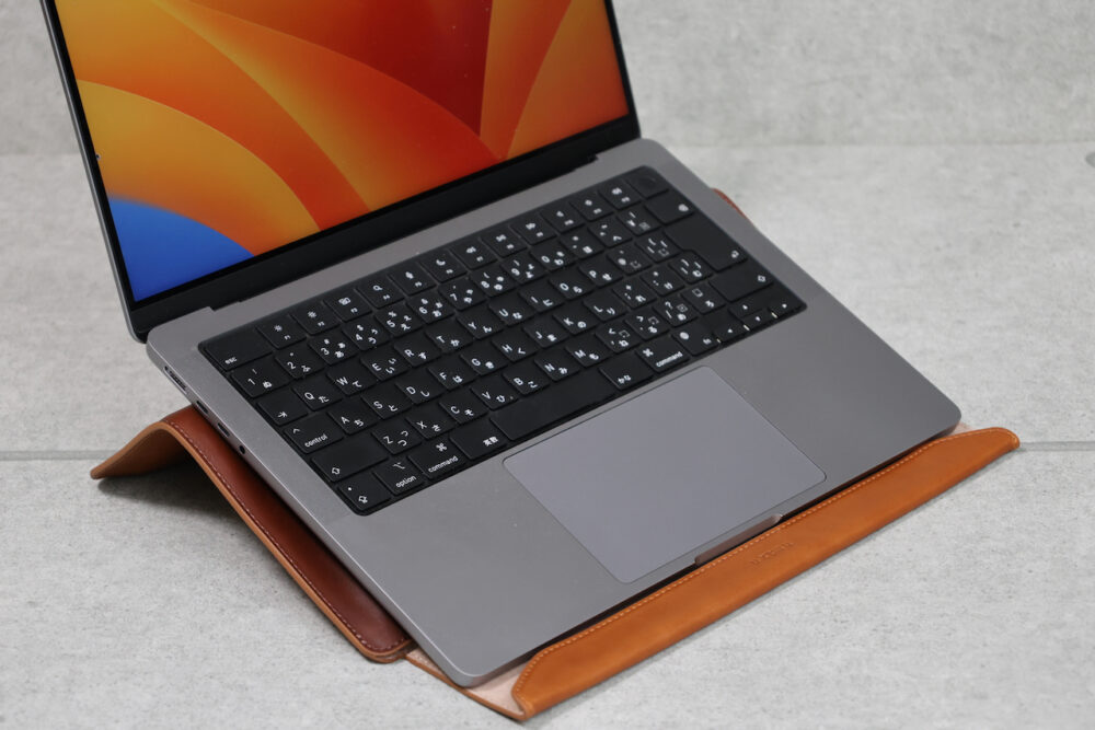 ご覧のように、フラップ部分先端を折り曲げることで、MacBookを乗せることができる。