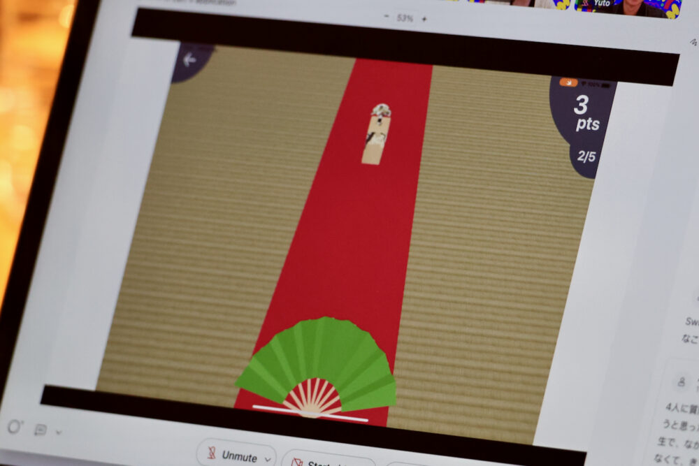 『枕』と呼ばれる台に乗った、『蝶』と呼ばれる的に向かって扇子を投げて、当たったあとにそれぞれがどのような位置関係になったかによって点数を競うゲームなのだが、その位置関係を表す『銘』が、和歌などにちなんだもので非常に難しい。しかし、このアプリは自動で『銘』を認識してくれるので、誰でも遊べる。扇子の投げ方にかなりコツがある感じで、非常に面白く遊べそうだった。