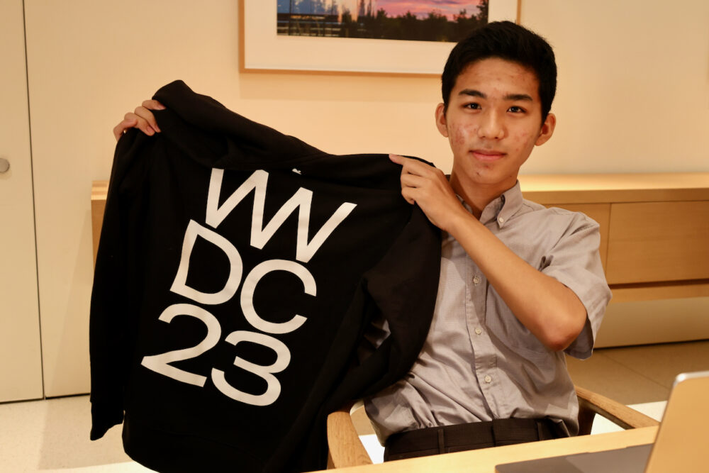 京都の洛南高校の荒川陸さんは、今回の入選者の中で、唯一の高校生。入選者にプレゼントされた、WWDC23のアウターを持ってきてくれた。ちなみに「USサイズなので、想像よりはるかに大きくてダボダボ」とのこと(笑)
