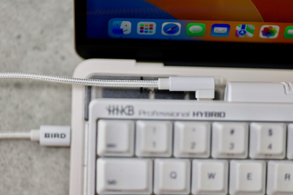 もともとは、HHKBを尊師スタイルでUSB接続するために開発されたケーブルだが、パソコンのサイドで横に飛び出さないのも便利。
