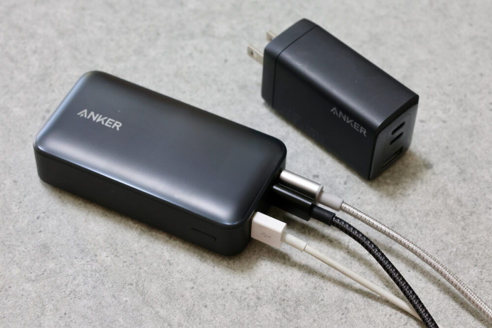 ちなみに電源アダプターはAnker 735 Charger (GaNPrime 65W)、モバイルバッテリーはAnker Power Bank (10000mAh, 30W)を使っている。
