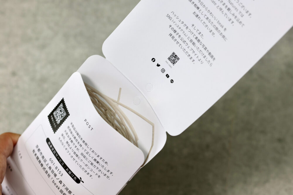 デザイナーらしく、パッケージは非常に凝ったものになっていて、背面には使い方、開くと『あなたは #beakmate です』というメッセージ、試用終了後に本体を返送したらクーポンが送られるという知らせ(資源である磁石回収のため)が現れ、さらに内側はbeak(くちばし)のパッケージらしく、鳥の巣のグラフィックが描かれている。ほとんど見えないこういう部分が工夫されているのが楽しい。